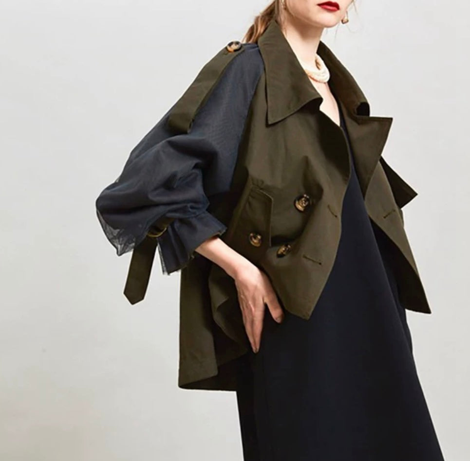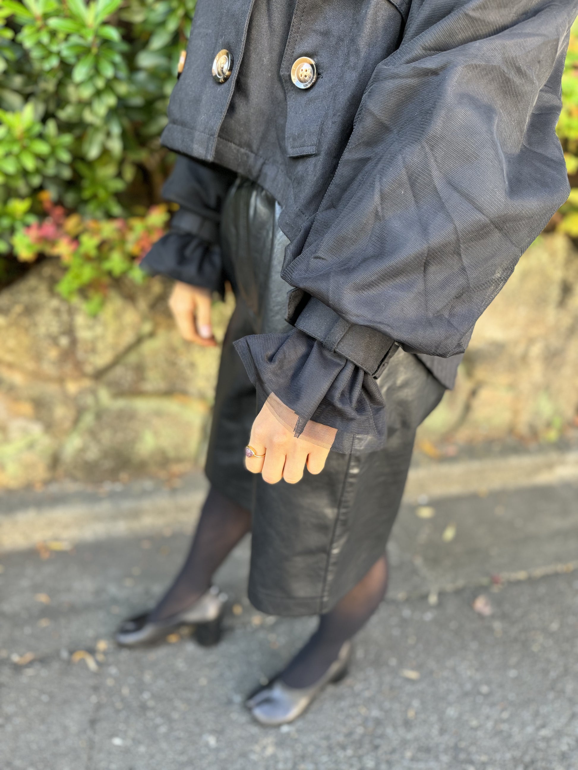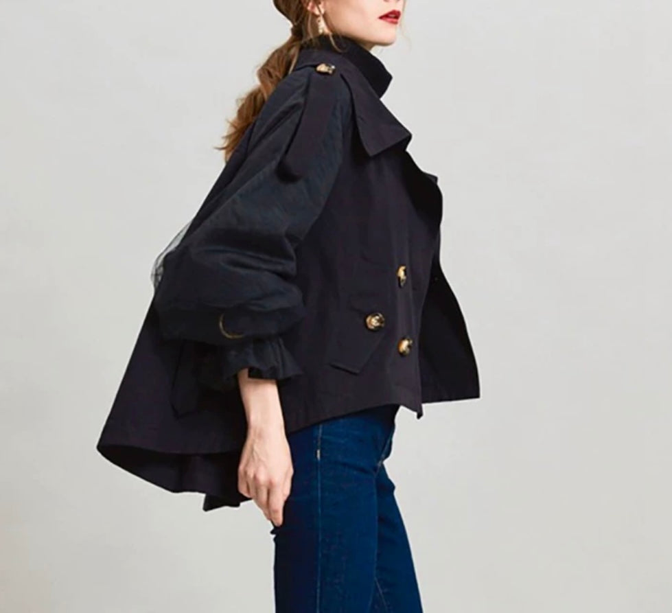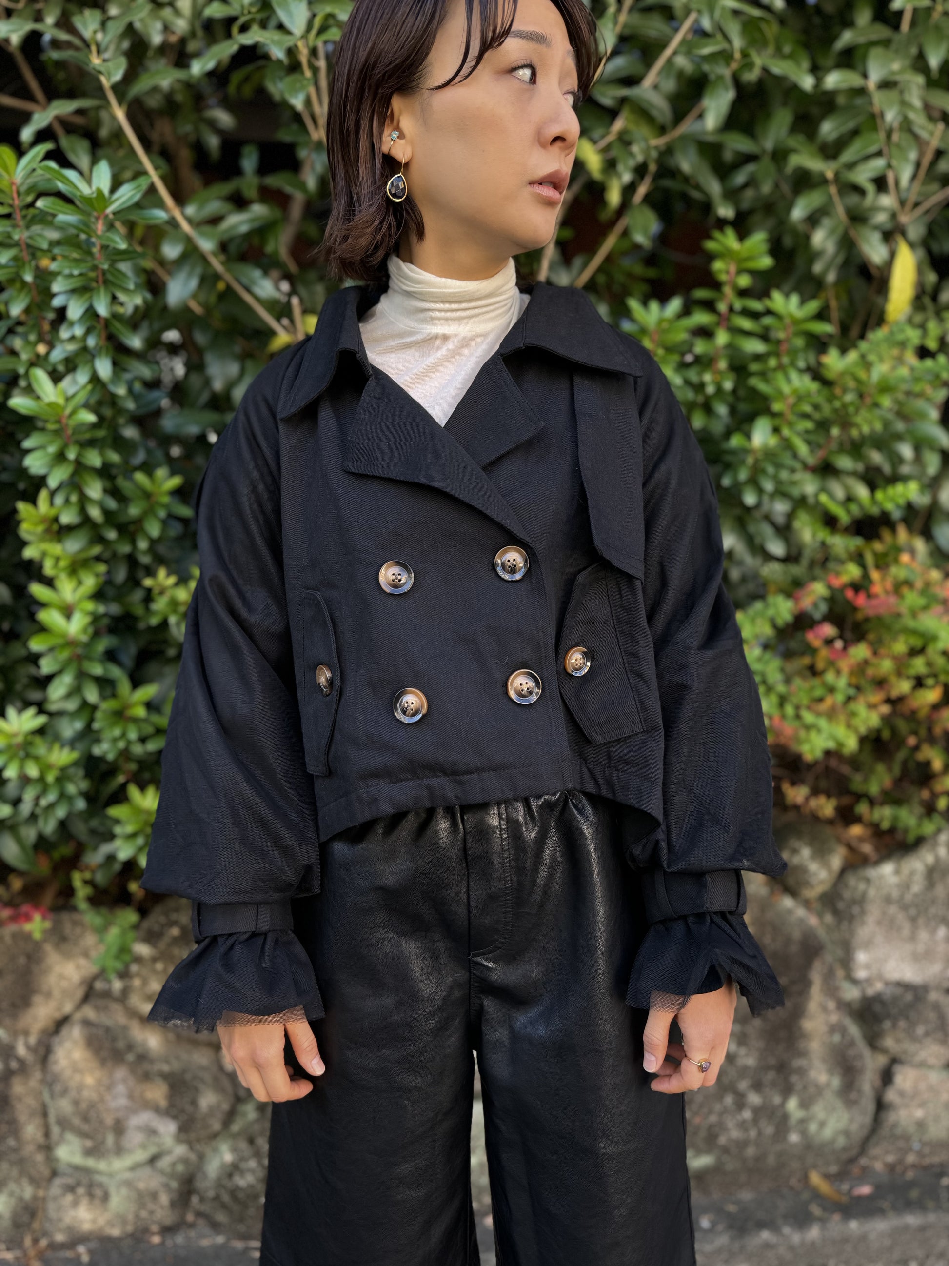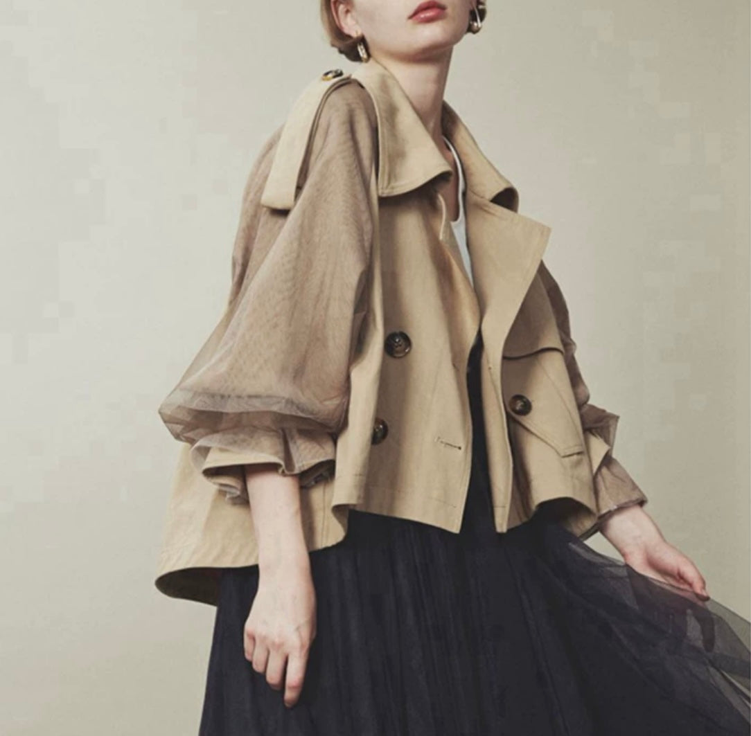袖のオーガンジーが美しいショート丈のダブルトレンチコート。